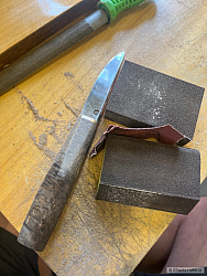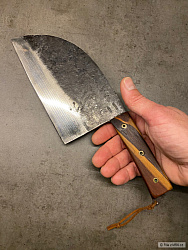 Slovo dalo slovo a nechal jsem si ho vyrobit od Romana Redwolf Halase, který ho překoval ze starého pilového kotouče. Kuje a kalí si sám v punkové dílně, odhadl to na 58hrc. Drží fajně ostří a když je třeba, brousím ho na syntetice Cerax.