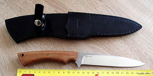 Mám rád štíhlé nože, tak jsem poprosil Gomze a jeden kudlík mi tuhle přistál u dveří! Necelých 27 cm, ocel 690, tvrdost nevím, šířka 25mm aby šel za ostřím, váha jen 134 g, s pouzdrem 260 g.