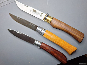 Old Bear dorazil, tak si dovolím dvě porovnávací fotky - Main German Line vs. Opinel VRN 10 vs. Old Bear XL Carbon. Starý medvěd dorazil velmi dobře zpracován, jde krásně otevírat (třeba ve srovnání s Opinelem), nemá rozebíratelný čep a budu ho muset ještě přebrousit - tovární nabroušení není bůhvíjaké. Jinak krásný praktický nůž, který, jak doufám, bude žít (ve smyslu patiny na čepeli a mosazné objímce).