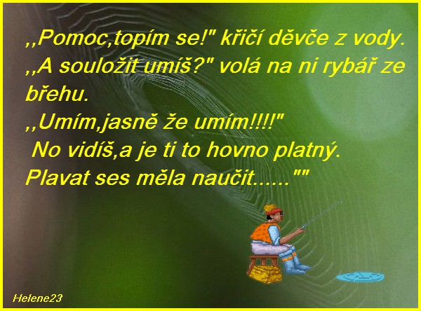 Přijde chlapec k rybáři a povídá: pane vsaďte se o stovku, že zatluču do země žížalu. Rybář mu odpoví: „to se klidně vsadím“, a podá mu žížalu. Chlapec vytáhne sprej, postříká žížalu a zatluče ji do země. „Vyhráls“, povídá rybář. „Zítra si příjď pro prachy a ten sprej mi pujč, to je to dobrý fór“. Druhý den chlapec přijde a rybář mu dává 500 Kč. Chlapec mu ale praví, že se vsadili jenom o 100 Kč. Rybář praví: stovku máš ode mne a ty čtyři ti posílá moje stará.
