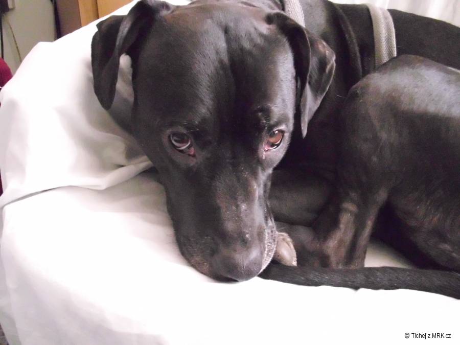 Tichej - >> tak máme doma maroda ... při venčení si někde ve sněhu rozřízl packu, ten největší polštářek ... a "chorobu" hraje znamenitě :-)))