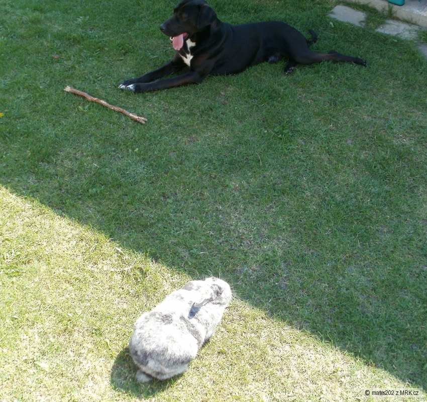 Vím, že jsem sem už zápis dal, ale kdo má psího kámoše pochopí = narazil jsem na tuto letošní fotku = je to Labrador(vodní pes), ale bojí se vody, je to i lovecký pes, ale králík ho nechává v klid, asi má názor - Králík není žrádlo ale kámoš? = veterinář tomu nechtěl věřit pes a králík spolu blíže jak deset metrů........no Roník je asi jiný.....