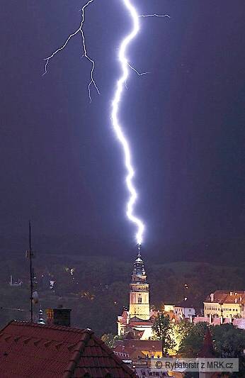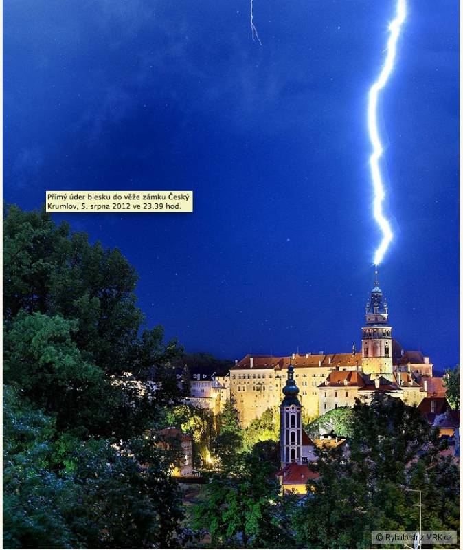Přímý úder blesku do věže zámku v Českém Krumlově ze dne 5. srpna 2012 - čas 23. 39 hodin....