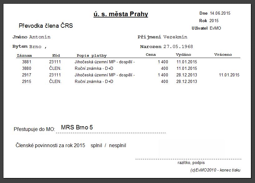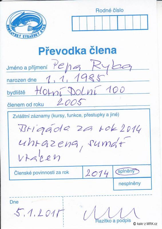 Z takto vzorově vyplněnou převodkou odejde člen do nové MO, kde si ovšem dopředu zjistí, zda jej za člena vezmou. Brigádu zaplatí či odpracuje a sumář vrátí u původní MO, v nové zaplatí členství a povolenku pro rok 2015.