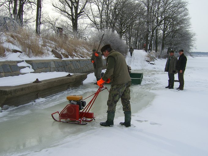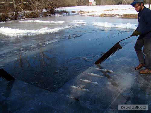 použít se dá samozřejmě i klasická pila, ale o tom bych se poradil s někým kdo to dělá, protože nevím jak je to s olejem. Dle mého může olej z mazaní lišty a řetězu vytvořit na hladině film, který bude bránit výměně plynů, kvůli kterému se to také dělá. Sám jsem to vždy sekal ledařskou sekyrou.