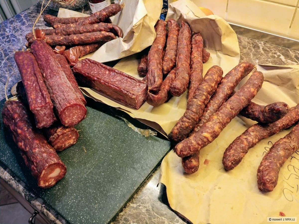 podle odhadu a chuti několik stroužků česneku, celý pepř, nové koření, bobkový list a jalovčinky. Popř. přidám pár špetek tymiánu. Důležité je mít pokud možno vše v kameninovém soudku při stálé teplotě cca max. do 6 stupňů (máme pro to vykuchanou lednici). Kamenina drží stálou teplotu a reaguje velmi pomalu na její výkyvy. Shrnuto: Za 5 týdnů měním lák 4x. Poprvé 2x vždy po týdnu pouze slaný. Maso stále pouští krev a ta se právě kazí. Další 2 láky měním přibl. po 10-ti dnech se svařeným kořením a to: nejprve střídmě česneku, jalovčinek i tymiánu. Na poslední finální lák přidávám koření již více (ale nepřehnat hlavně česnek a tymián) a roztok obohatím o 0,5% moučkového cukru. Maso je křehčí a má lepší barvu. Před uzením opláchnu, předehřeji v teplé, asi 65 - 70 stupňů vodě přibl. 40 minut a dám okapané do vyhřáté udírny asi na půl hoďky při 80 C osušit. Pak zbylých přibl. 12. hod. udím 65-70 C. Nedělám větší kusy než 1 kg (spíše raději menší) a pokud se vše do nádoby dobře nakládá, stačí i na 30 kg masa 5L. Důležité je zachovat teplotu skladování a poměr soli. Maso zatěžkat, aby k němu nemohl vzduch a bylo potopené v láku přibl. 3cm, sledovat a pak může být naložené i celkem 7 týdnů. Možná to lze na kratší dobu dohnat vyšší koncentrací soli......???, ale toto máme 30 let odzkoušené.
