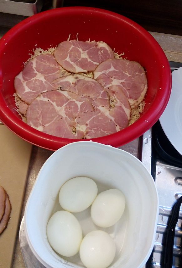 Postup je docela jednoduchy. Povařit uzene(krk,rolšunku,klobásky) a vývar okyselit a případně dosolit.Dál uvařit hromadu vajec a pak to v míse skládat povrstvach.Maso,klobásky,vajca a prosypávat čerstvym strouhaným křenem. Nakonec zalet tym okyselenym vyvarem a nechat přes noc v lednici zaležet.