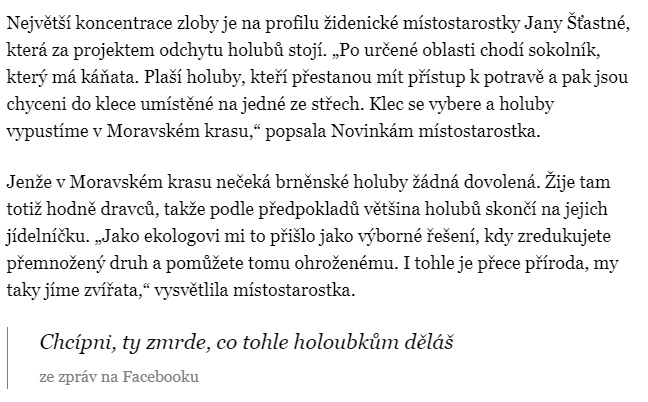 ... obhajovat přemnožené holuby ve městech, kteří jsou přenašeči různých závažných chorob, přenositelných na člověka (/ https://www.ceskenoviny.cz/zpravy/337459 ), to už je vrcholová ukázka naprosté debility ...