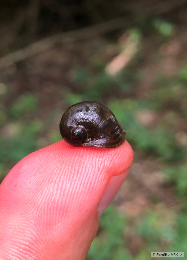Malej vodní plž z čeledí plovatkovití, výskyt mírně tekoucí vody……ten červenej palec není přepálenej kontrast, to je od futra…..;o)