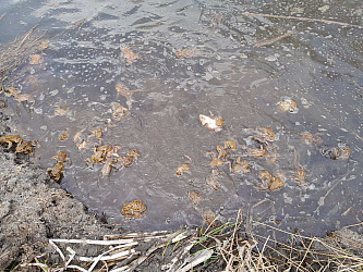 Jediné vysvětlení je, že to ti blbové přejíždějí schválně. Tak jsem vzal vanu, co mám na špinavé věci a celý úsek prošel. Nasbíral jsem dvě várky žab (na fotce je ta větší, cca 40 ks) a odnesl je kus cesty směrem k rybníku. Cestou zpátky k autu jsem byl kontaktován dvojicí na šrot vylitých individuí, která hrozně zajímalo, co tam dělám. Poslal jsem je do řiti a odjel.