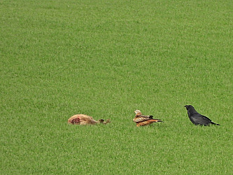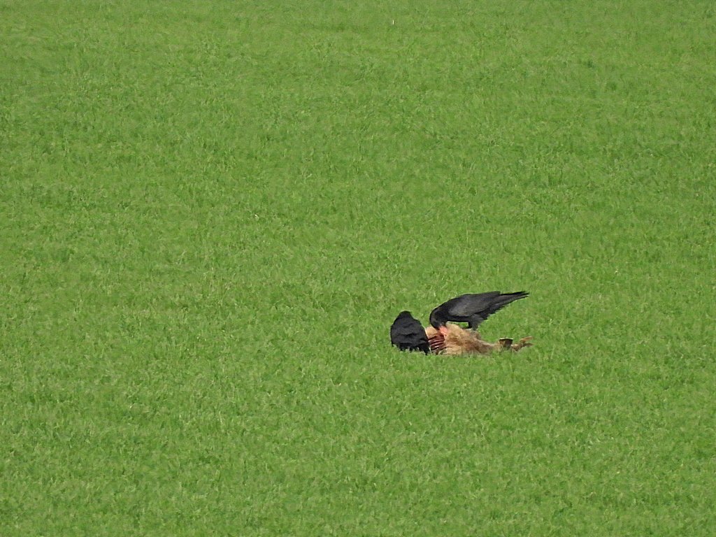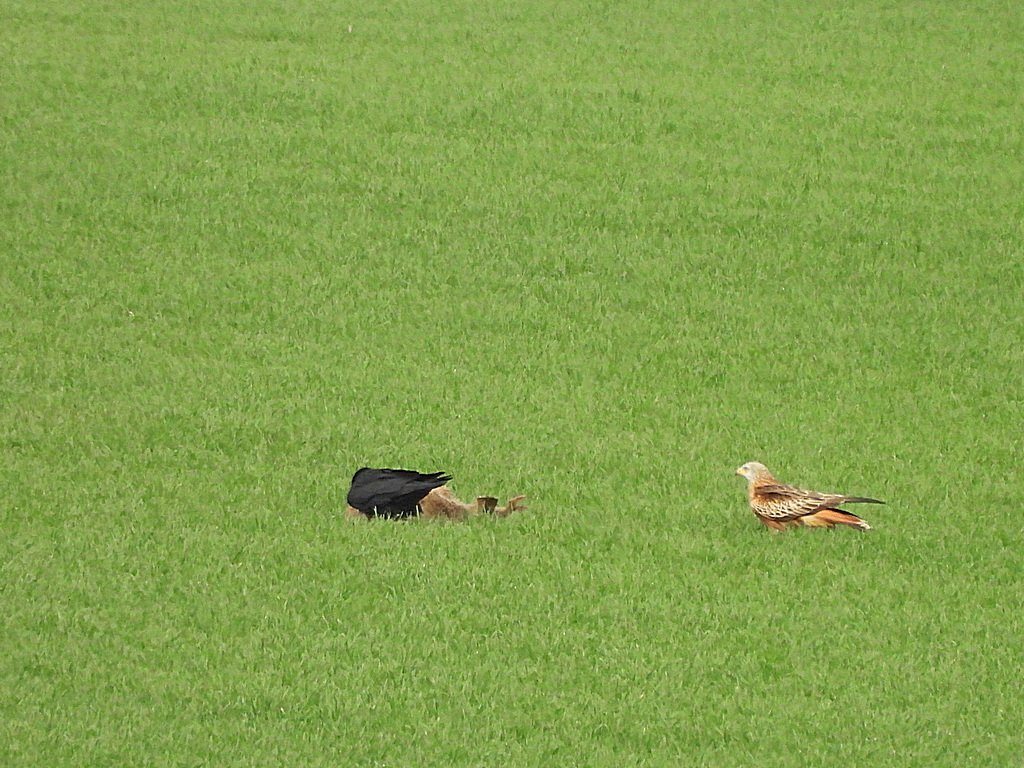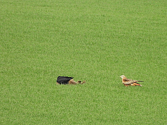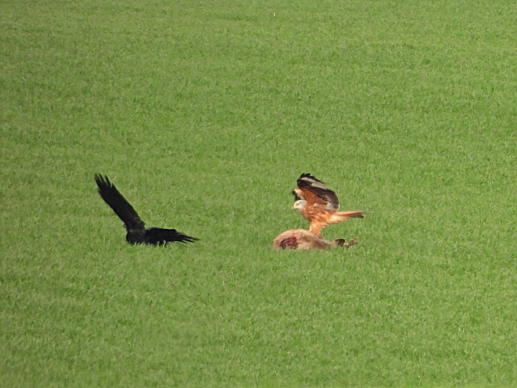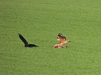 Dnešní souboj, foceno z velké dálky, líp to můj amatérský foťák nedá. Bohužel se hnal chcanec s kroupama, tak nevím, kdo nakonec vyhrál :-) Ale na luňáka to byla přesila.