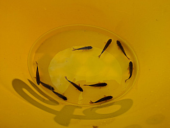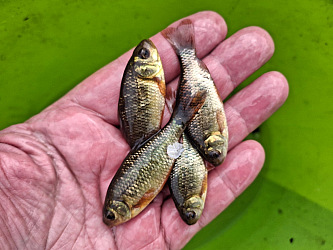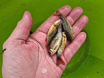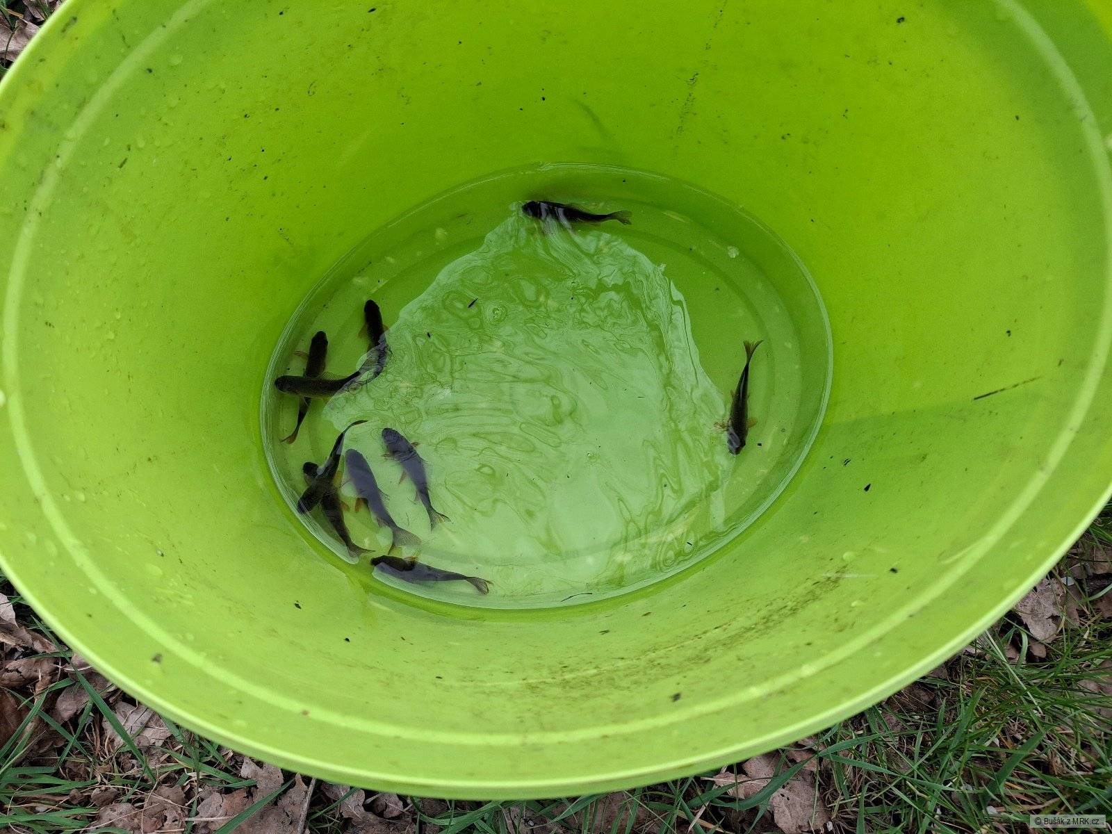 Tak chyceno prvních 10 malých karasů obecných. A šup s nima do převozních kýblů. Potřeboval bych chytit aspoň 200 kousků, zatim pro 2 zájemce do nových chovů