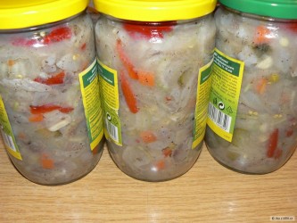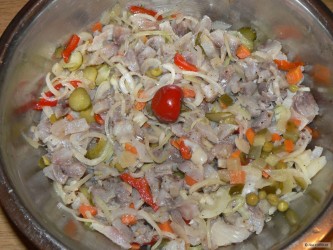 V míse smícháme nakrájené rybí filety s cibulí, sterilovanou zeleninou, dochutíme čerstvě pomletým pepřem.