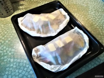 Poté porce otočíme kůží dolů, podlijeme vínem a pečeme ještě 10 – 15 minut. Během pečení občas porce přelijeme vypečenou šťávou.