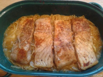 Do pekáče dáme olej, cibuli a v troubě vyhřáté na 180°C cibuli trochu opečeme. Na opečenou cibuli vložíme porce kapra kůží nahoru a cca 10 - 15 minut pečeme.