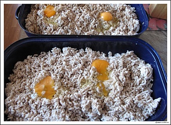 Mlýnkem proženeme maso s občasnou lžíčkou strouhánky a cibulí (1 kg masa = 1 menší cibule). Do vzniklé hmoty přidáme podle chuti pepř (nemusíme šetřit) a cca na 2 kg 1 vajíčko. Lehce promícháme a vytvoříme gabroše (hovínka), které okutálíme ve strouhánce. Ve friťáku smažíme do červena.