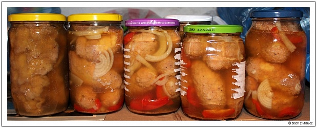 Navíc sterilizací nálev rychleji projde narozdíl od naložení jen za studena. Chuť karbanátků a nálevu se srovná. Druh ryby nebude mít vliv na trvanlivost. Darďas dělá mix sumec - kapr, já dávám mix ryby s podbradkem z prasátka........každý máme děláme podle svého osvědčeného postupu a receptu.