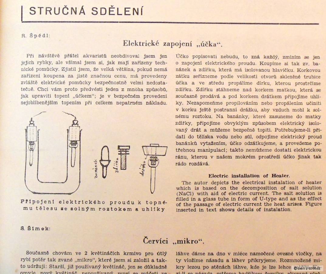 Akvárka jsem vyhříval skleněným "účkem" se solným roztokem, uzavřeným špunty s dvěma elektrodami z ploché baterie, napájenými 220V, případně pod hladinou ponořenou baňkou žárovky ...:-))