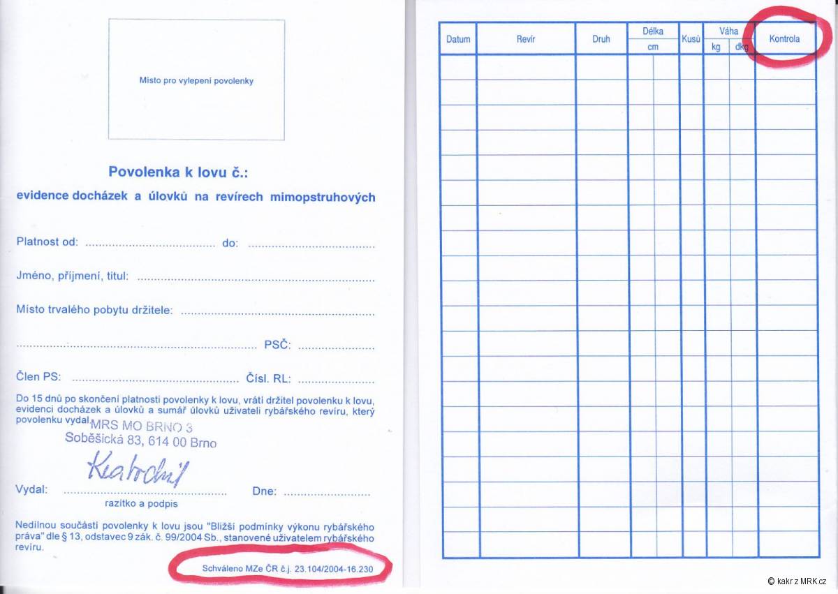 K zápisu kontroly do povolenky - MRS má formulář povolenky schválený Mze pod č.j. viz první strana povolenky červeně. Kolonka kontrola je na stranách zápisů rybářů také v červeně vyznačena.