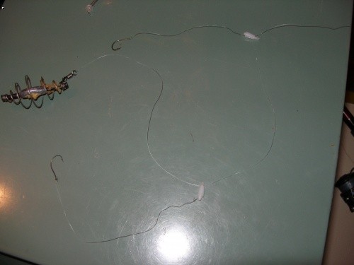 Určeno k lovu kaprů a cejnů. Používat malého koncového policajta! Montáž se skládá ze dvou návazců(cca 20cm), které jsou ke kmenovému vlasci spojeny plastovými spojkami(obrázek) a dole s krmítkem na karabince a obratlíku