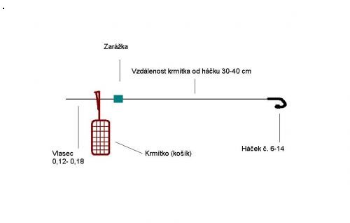 Vezmeme si kmenový vlasec a provlíkneme jim očko krmného košíku či jiného krmítka. Poté zajistíme gumičkou nebo zarážkou tak, aby nám zbyl vlasec o délce 30-40cm. Na konec tohoto vlasce se naváže háček a sestava je hotova.