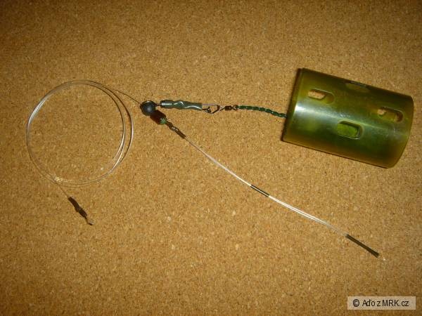 Na silone vytvorim slucku z ramenami dlhymi cca 8cm. Odmotam si 60cm silonu z cievky. Odstrihnem a navleciem zarazku (drennan centre stop, moze byt aj obmotana izolacna pasa, ktora sa zarazi na uzliku). Vytvorim druhu slucku 1cm veku. Navleciem zmrstovacie hadicky a nad parou z cajnika ich vystavim posobeniu tepla. Navleciem klip na zavesenie krmitka a montaz je pripravena k lovu. Na spojenie kmenoveho silonu a montaze volim trilene uzol