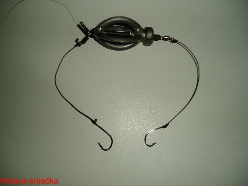 Připravíme si asi 1.5 cm bužírky, párátko, 2 návazce s háčky a obratlíky a průběžné krmítko. Na kmenový vlasec navlékneme bužírku, za ní za obratlík první návazec, potom krmítko a nakonec uvážeme druhý návazec. Potom zarazíme do bužírky párátko, odlomíme zbytek a celé to stáhneme k sobě. Tím je to hotové. Použití srkačky nemusím popísovat, to tu bylo už popsáno.