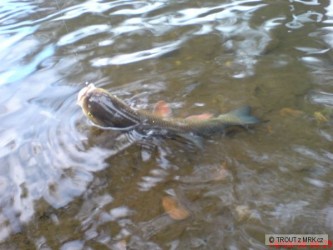 Odpoledne jsem zajel asi na 2,5 hodiny zamuškařit. Využil jsem toho, že jsme tu měli Vinobraní a tudíž u vody jsem nepotkal skoro nikoho. Jenomže to byla snad jedinná výhoda dnešního lovu. Ze dne na den začalo takové to klasické podzimní počasí, tudíž se ochladilo a na ryby to asi mělo vliv. Kolačka se dělaly jen občas a proto jsem většinu času nymfoval. Chytil jsem na nymfu jen 3 potočáky do 20cm a na suchou mi jeden spadl. No co, divočina to sice dneska nebyla, ale u tý vody už začíná být taková ta krásná podzimní atmosféra.