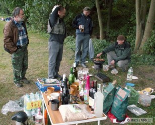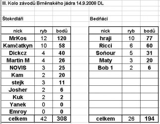 Tradiční chytačka BJ spojená s grilováním byla zdařilou akcí. Sešlo se nás asi 16 chytajících, pár členů doprovodu a jeden Matyho pes. Začalo to dobře a to várnicí fazolové polévky, poté jsme přešli na bednu ořechových rohlíčků, plech jablečného štrůdlu, mramorovu bábovku a pokračovalo se grilováním mnoha kg naloženého masa z různých savců i opeřenců, několika druhy grilovaných uzenin a zajídalo se to grilovanou zeleninou se žampióny. Občas jsem zahlédnul že někdo zvládnul i krajíc chleba. K pití se podávala ze začátku slivovice, poté burčák, několik lahví šampáňa a v odpoledních hodinách nealko pivo, čerstvá káva a nějaká ta minerálka. Aby se neřeklo tak jsme také chytali ryby přičemž asi nejvíce bylo kaprů a plotic, okrajově se do toho připletl okoun, lín, amur a cejn. Krátké závody bedňáků proti štokrdlářům tentokráte vyhráli štokrdláři, a to výrazně :-) , takže putovní pohár si nějakou dobu pro změnu užijí oni. O zábavu nebyla nouze a nekončilo to pouze sem tam urvaným anglánem i s kaprem ale na hladině plaval i celý bič ( také s kaprem) a poté i jeden ropovodtopsed ( jak jinak než také s kaprem ). Největší rybou byl asi kapr 48 kterého vydoloval MM a naopak nejmenší byl pidiokounek kterého lapil Yanek. Chtěl bych tímto všem poděkovat za moc pěkný den u vody, za všechen um který vložili do závodů a za hodnotné ceny.