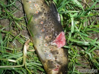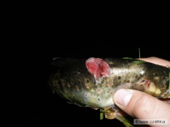 večer jsem si vyrazil na pstruhy při zvětšené vodě po povodni ryby předspané žížalami.jeden kuriozní úlovek pstruha cca 20 cm co měl 1 cm díru na sobě.