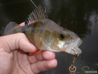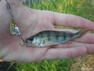 Vyrazil jsem v hicu přes poledne chvíli zavláčet. Výsledkem bylo pár okounků, několikero pstružíků a jeden kámen. Bohužel, nejlepší místa přede mnou vždycky projel nějakej vodák, takže v nich ani záběr :-(((