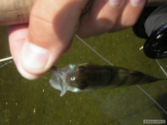 Dnešní koupání s drahou polovičkou jsem vzhledem ke stahujícím se mrakům, obrátil na kratičký pokus opět s plavačkou. Drahá mi dala půl hodiny a celou dobu mi ze břehu fandila se slovy "pojď už, je mi zima", nebo "stejně nic nechytíš". Nakonec se mi podařilo i přes její velkou podporu vydolovat jednoho prcka a tím jsem radši při pohledu na její výraz tváře, pro dnešek s chytáním skončil. Jedno ale vím jistě, příště už půjdu na ryby sám...