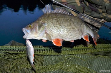 Testování nové výbavy na pstruhovém rybníku před zahájením. Candátek vyháčkován a puštěn ve vodě.