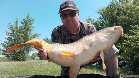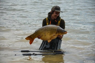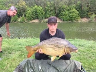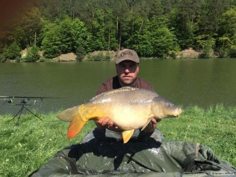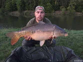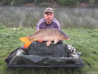 Když jsem vyjížděl na tuto, pro mě neznámou svazovou vodu. Byl jsem plný očekávání. Spousta strategií se mi honila hlavou, ale nakonec to bylo mnohem lehčí :). Než jsem si nachystal první prut k náhozu, ukázali se mi na hladině dvě těžké ryby. Jejich výskoky byly od sebe vzdáleny cca 20m. Bylo hodně pravděpodobné, že se na těchto místech bude ryba krmit. Návazce jsem udělal se svlékací šňůrky 25lb, na konec montáže jsem použil pro mě zatím neznámý háček. :). Na háček krátké rovnátko a 5cm od něj plastické olovo. Pod háček jsem nastražil pikantní boilie, které jsem zabalil do obalovací pasty stejného druhu. Nahodil do míst, kde se ryby ukazovali. Kolem jsem naházel cca 3/4 kila boilie a za dvě hodiny jsem se koupal s tímto skorometr měřícím šupináčem. Pokud máte kvalitní nástrahy, chytlavé návazce a víte kde se ryby zdržují, je to snadné :)