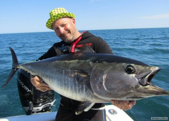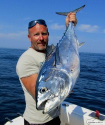 Tak sem se konečně dočkal a dostal jsem nádhernou Bacoretu.....menší zato rychlejší druh tunáka. Málem mě zas vyškolila páč na moři sem zatim pěknej dřevák, ale nakonec štěstí stálo při mě. Zdolali jsme i dva větší obecnáky ale ti byli na náhozy kapitána Zdendy, zkušenýho mořskýho vlka takže to už nemělo pro mě takovou váhu. Rychlost těchto ryb mě vyloženě dostává takže určitě vyrazim zas