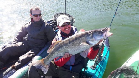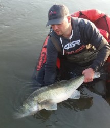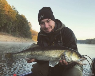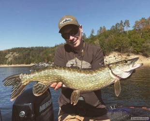 Po dnu kdy jsem se trefil do candátů, jsem vyrazil hned ráno znovu. Tentokrát jsem s sebou vzal kamaráda Toma a mého tátu. Chtěli být u toho, pokud by se mělo opakovat to o čem jsem jim vyprávěl den předem. Ráno přijíždíme k přehradě. Z dálky vidím, jak už Tom bičuje vodu. Honem nachystat udice a hurá na lov. Parkuji vedle Toma, který je zatím bez záběru. Hned na první hod dostávám prdu do nástrahy a vytáhnu krásnou statnou rybu. V ten okamžik vím, že se bude opakovat to co včera! Další hody, další záběry! Zažil jsem při candátech hodně, ale toto je pro mě nepochopitelné. Po tomto extrému vše utichne. Voda jako by bez ryb. Čas letí a já už pomalu zapomínám, co se stalo. Z nesoustředěnosti mě vyruší pořádná pecka do prutu. Opírám se, ryba se mi nedaří zvednout. Když Tom vidí, jak nakládám rybě, komentuje to slovy, že jsem něco podsekl. Ani nemluvím, vím co zdolávám. Po chvíli se vynoří na hladinu strašná ryba. Není to běžná devadesátka, jakých už jsem chytil spousty. Ani nemluvím a rybu rychle podebírám. Honem ji zbavím háčků a všichni tři si ji prohlížíme. Rychlé změření a pouštím ji zpět do přehrady. Ač jsme se snažili, jak chtěli, víc jak poctivých 99 cm se nám naměřit nepodařilo. Váhu jsem s sebou neměl, ale podle podobných ryb, které jsem dříve chytil, ryba vážila cca 9,3 – 9,5 kg. Víc určitě neměla. Teď nezbývá než se těšit, co přinesou za překvapení následující dny…