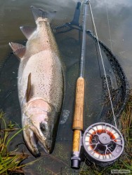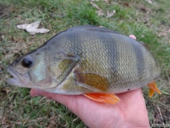 Dnešní ryby s příběhem. Prvního jsem chytil duhaka po 5-ti hodinách chytání na jezeru. Ryby se ukazovaly ale daleko. Pak se kus ode mě ukázala ryba jak delfín. Druhý hod a byl tam. Pak dva malý duháky. Na cestě zpět jsem si z vysokého břehu všimnul potočáka jak jezdí mělčinou a žere něco ze dna. Chvíli jezdili dokonce dva. Házel jsem na ně přes půl hodiny schovaný za keřem. Urval jsem dvě mouchy o stromy. 3x mi k mušce přijel a nevzal. To vše ani ne na 5m. Nakonec jsem ho ale vydráždil a vzal to. Musel jsem za ním skočit ze 2 metrů do jezera. Naštěstí jswm ho udržel dál od vodních kytek. To vše na 0,20 FC a 4 prut