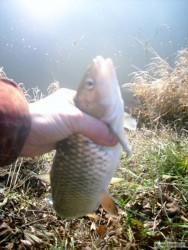 Dnes nám ani to sluníčko nepomohlo k oteplení , kosa byla pěkná . Zkoušel jsem nová místa , jelikož je dost vody . Našel jsem jedno , kam určitě při vyšší vodě budu chodit . Dokonce jsem chytil i dva kapříky Když jsem pro něj sahal , abych ho vyfotil , málem mi upadla ruka . Pak jsem nemohl deset minut nahodit , jaká mi byla zima . Pak začaly brát tloušti jako blázni . Za hodinu osm kousků . Ty už jsem jen vyhákával ve vodě .