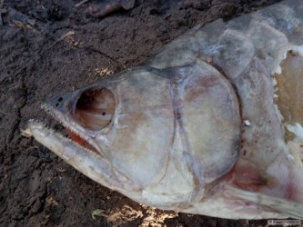 Dnes jsem na mlýnské strouze našel něco co mě dost překvapilo nevíte ňekdo co je to za rybu ? Asi 50 cm dlouhá obrovské šupiny a huba plná zubů. Je možný že by to v Labi přežívalo?