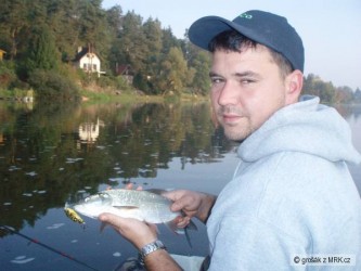 Z plánovaného ranního výjezdu se vykubal přijezd k vodě v 9:45 (musel jsem zajet ještě do města pro ranní pečivo..). Nejdřív jsem zkoušel pod jezem v Kožušanech - ze strany od rybníka chycen na 8cm kalipso tloušť 30cm a jedna kudla, pak jsem přejel na druhou stranu, protože tam bili do rybek boleni - 2 hodiny házení thrillem, hermesem, longcastingem vyšly s nulou. Kolem 13h jsem se přesunul k Tovačovu, kde jsem spíš procházel řeku, na Bečvě u jezu lidí jak na Václaváku, tak jsem jel jinam, nechal auto v Troubkách a vydal se zkoumat moravu. Kolem 15h jediný záběr na už skoro hotově proházeném místě mi pod nohama střelila do SR7SSH deep runnera 80cm štika, to jsem měl woba asi 30cm od špičky prutu,tak vzala natvrdo přes brzdu asi metr vlasce a vypla se.......ale bylo tam hezky. Ještě stojí za zmínku, že jsem tam našel zaražený kůl, od kterého šel provaz do řeky a na konci šutr se 3 hákama na sumce..........lidi jsou prasata