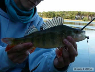 Včerejší odpolední vláčka s Nielem a jeho tátou z počátku nevypadala moc dobře.Každý jsme po 2 hodinách měli 1-2 okounky a skoro jsme to chtěli zabalit.Pak jsme ovšem přešli na místo na které dlouho nezapomenu.Co nához to záběr.Okouni od 15-30 cm se vrhali na vše co jim bylo předloženo. Po nahození tmavého KOPYTA dostal Niel ránu do prutu.po 5ti minutách se u břehu ukázala štika kterou jsme shodně odhadli na 90+.Krásný souboj skončil bohužel jijím vítězstvím a tak jsme ji ani nevyfotili:-(. Mě pod nohama spadla z twistera štika cca 70 cm, ale jak bych mohl být po ulovení 24 okounů zklamaný. Celkem jsme ve třech lidech dostali asi 70 okounů. Nejúspěšnější byly 2' Kopyta a smáčky