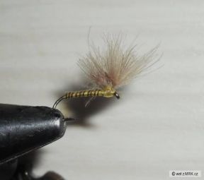 Najprv vytvorime telo z zltej nite, ktore nasledne prekruzkujeme hnedou. Priviazeme tri cdc pierka a vyuzijeme aj spodnu cast cdc. Takato muska skvele plava a ryby ju ochotne beru. Velkostne mozme ist az po 20, ale 14-16 su postacujuce velkosti pre vacsinu pripadov. Mozme ju stlacenim cdc kridel upravit do polohy parasut, alebo naopak ako shuttlecock.