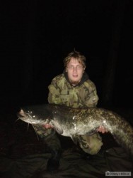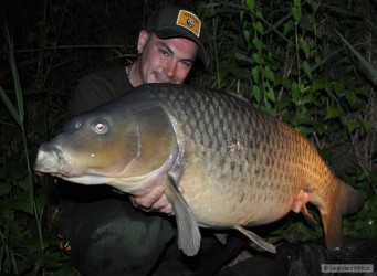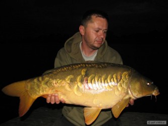 ...po ulovení Pupkáče, tedy v pátek jsem samozřejmě musel jako každý smrtelník do práce, ale myšlenkami jsem byl stále na břehu pískovny. Proto jsem v práci nevydržel dlouho a odešel dříve, abych co nejdříve z5 na místě. Ještě než jsem ráno odjel jsem pořádně nakrmil, abych po příjezdu nahodil do roz krmeného. Tak se taky stalo a já umístil pruty z5 na svá roz krmená místa. Záběrů bylo mnoho, ale žádný z kaprů nebyl větší 10kg, naopak většina z nich byli úplní kapří dorostenci kolem 5kg. Z toho důvodu jsem již další, tedy Sobotní ráno vůbec nekrmil. Celý den proběhl dle očekávání bez akce a já jen před setměním pruty přehodil a ke každému nacobroval zhruba 20 kuliček jak jinak než již zmíněné novinky. Záběr přišel zhruba kolem půl desáté, tedy po soumraku. Byla to poctivá a vytrvalá jízda, na ten stejný prut, na který přišli i oba předešlí kapří velikáni. Kapr v jízdě pokračoval i po zvednutí prutu a než jsem ho dobrzdil, tak vytočil z cívky určitě 50 metrů. Měl jsem fakt strach že o rybu přijdu v nedaleké potopené větvi, nebo jiné vázce, ale soupeř se prostě nehodlal vzdát. Přetahovaná o každý metr trvala minimálně 30 minut! každý metr vlasce který jsem navinul, si kapr vzal okamžitě z5, byl to supr souboj kdo z koho. Po té době, však již rybě začali docházet síli a já získával převahu, v podobě úspěšně namotaných metrů vlasce. Už jsem si říkal že to snad musí bejt nějaká pod seklá ryba, když v tom jsem ve svitu čelovky uviděl kapra poblíž břehu. Z prvu mi tak velký nepřipadal, ale po jeho úspěšném podebrání, jsem hned věděl že je dobrej! Na podložce jsem ho odhadoval přes 17kg, ale kdž jsem ho pověsil na odváženou váhu, chvíli jsem tomu číslu nevěřil. Opakované převážení však potvrdilo prvotní váhu. Tenhle bojovník vážil na toto roční období naprosto perfektních 19kg!!!
