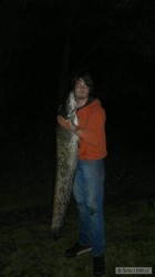 Krasavec 150 cm cca 25kg.. můj první jeseter v životě a hned taková ponorka. :) Byli jsme na víkendové výpravě na Skaličce (soukromá voda) a celou dobu jsme tahali jen malé cejny. V neděli jsem se probral v 5:45 na lehátku a uvažoval, jestli přehodit. Bouchl jsem tam Red halibut peletu s pva šňůrkou ověšenou dalšíma redkama. Začal jsem uklízet kolem stanoviště a najednou bomba do prutu. Zasekl jsem, myslel jsem, že je to kapr, ale najednou se jeseter ukázal v celé své kráse při výskoku, který připomínal skok delfína. Ten okamžik do konce života nezapomenu. Hrál si se mnou cca 40-45 minut, nakonec úspěšně zdolán a já vysmátý jak lečo! Rybolov je úžasný!!!