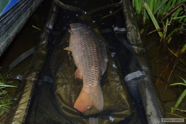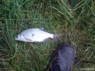 Ráno s vychádzajúcim slnkom a stúpajúcou teplotou som vytiahol jeden prút na ťažko a po dlhej dobe vytiahol matchku, nech si chytím aspoň niekoľko miestnych pleskáčov. Hĺbka vody cca 1,10 m. Prvý náhod s jedným zrnkom kukurice, okamžite krásny výtlak a ja celý bez seba, aké to bude supre. Po chvíľke dvaja tmavý pleskáči vonku a potom uťalo. Nechápal som, čo sa deje, no potom mi to došlo. Počas telefonátu s manželkou spravil plavák malý výtlak, následne sa pomaly plynulo pohol do strany, zásek a zo mňa sa stal smutný "štatista". Kmeň 0,16 mm, nadväzec 0,14 mm prekvapilo dlho odolávali náporu veľkého domorodca, no nakoniec to skončilo tak ako sa dalo predpokladať a v momente, keď som sa mi črtala iskrička nádeje sa rozhodol túto zábavu ukončil a zamieril si to smerom k leknovému polu. Stará Artax-ka držaná oboma rukami bola väčšinu času ohnutá po rúčku. Zážitok ale náramný... No a "zakŕmil" som dvoma plavákmi... :o(