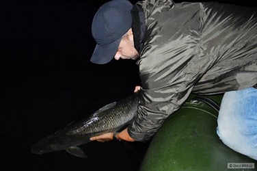 Asi na 10tej nához kopanec u dna, po záseku mně neznámý způsob boje. Až to zabubnovalo přes šňůru, měl jsem jasno. Byl jsem celkem posranej, co povolí jako první, ale Destina je naštěstí dost dobrej prut, takže jsem asi po 5ti minutách přitáhl ke břehu sumíka 90cm, kterého mi Pedro vylovil. Radost byla nepopsatelná, donutil jsem kluky mě nafotit ze všech možných úhlů. Protože byl můj první, šel samozřejmě zpět do vody. Rozdýchaval jsem ho asi 15 minut a dvě camelky.