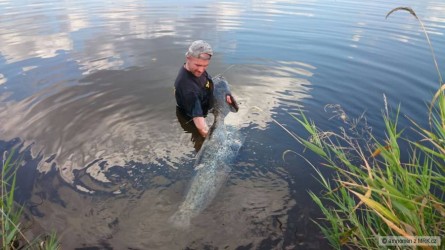 Domnělá přítomnost sumců mě donutila sáhnout po tvrdším prutu, ale na ten jsem neudělal ani záběr. Tak jsem zase vzal do ruky zase Destinu a začal házet. Klukům do toho docela hodně kopali menší candáti, já stále bez kontaktu. Otočil jsem se na Pedra a říkám: Dám tam asi Ohio, na toho smáka to nějak nejde. Asi 10 vteřin po tom kopanec jako kráva, záběr a okamžité zatlučení ocasem přes šňůru. Takže sumec numero duo. Ten už byl znatelně větší, naštěstí to nevzal do proudu a zezačátku rejdil pod nohama - asi byl překvapenej víc než já. Předseda s Pedrem udíleli cenné zdolávací rady, pořád jsem pumpoval, povoloval brzdu, dotahoval brzdu. Destinka ohlá až k rukojeti na hranici vlastních možností a mně nezbývalo než čekat, až se sumec utahá. Bejčil jsem ho dost opatrně asi 10-15 minut, ruka mě bolela jako kráva. Pořád jsem čekal, co povolí, naštěstí jsem na radu předsedy po první rybě všechno vyměnil, takže jsem se nakonec podíval do očí sumárovi 130 cm. Pedro mi ho vylovil a předseda nafotil, za což jim oběma moc děkuju. Zbytek lovu už jsem víceméně paběrkoval a vychutnával prolomení dlouhých let bez kontaktu s fousem.