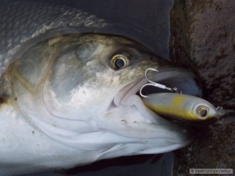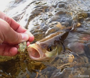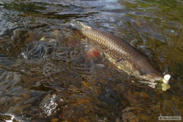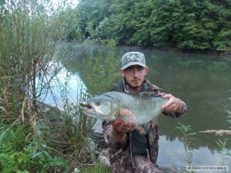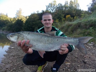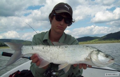 Byli jsme hodinku před setměním, ryby cosi sbíraly z hladiny. Nakonec se nám podařilo vymodlit pár svišťů a tohoto cca 6 kg krasoňe. Vše na fídr
