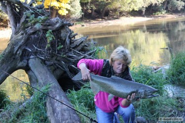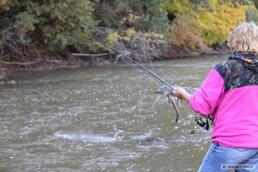 Dnes jsem byl trosku zklaman,kdyz jsem dorazili na misto lovu.Voda byla jako kafe,ne tak tepla,ale tak zakalena :-).Chtel jsem udelat par fotek lososu na tahu,ale pri tehle vode to opravdu neslo.Nicmene prostredi,kde jsme lovili a nami zdolavane nebo ulovene ryby to bohate vynahradily.
