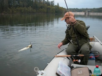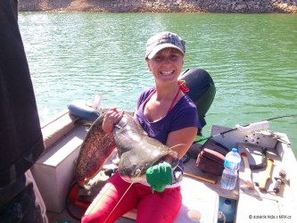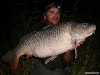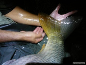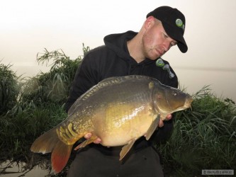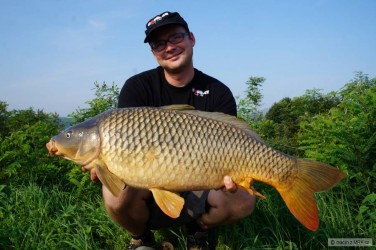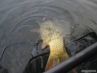 Měl jsem ještě asi 2 hodiny do odjezdu a tak jsem pod háček dal rychlovku k tomu určenou. Začali jsme pomale balit všechny věci a položil jsem už i pruty do trávy a složil stojan. Když jsem smotal jeden prut, uslyšel jsem rychlé protáčení cívky a po zvednutí prutu ucítil silný tah a tak jsem okamžitě naskočil do lodě a po dlouhém boji, kdy mě kapr povozil po vodě se mě ho podařilo podebrat.
